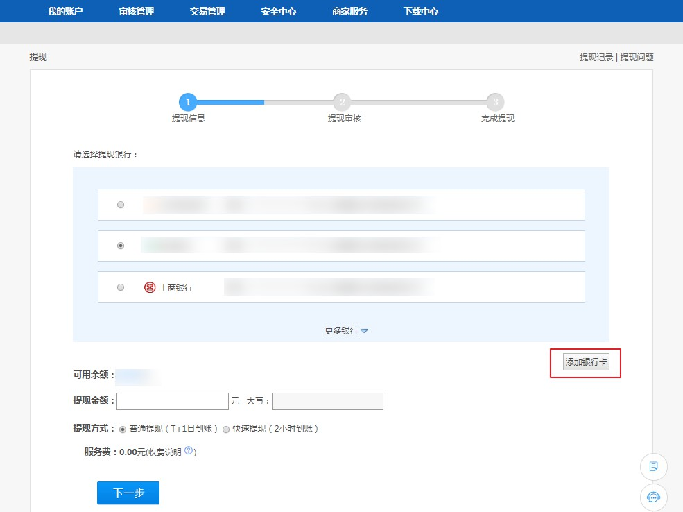 3)选择提现银行卡、提现方式,输入提现金额,点击下一步。