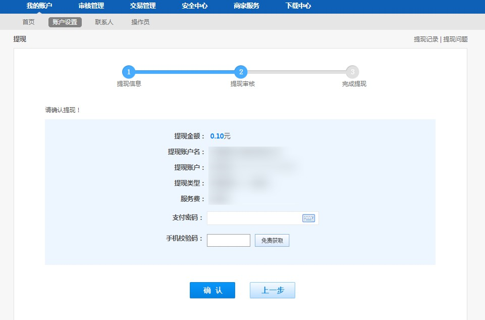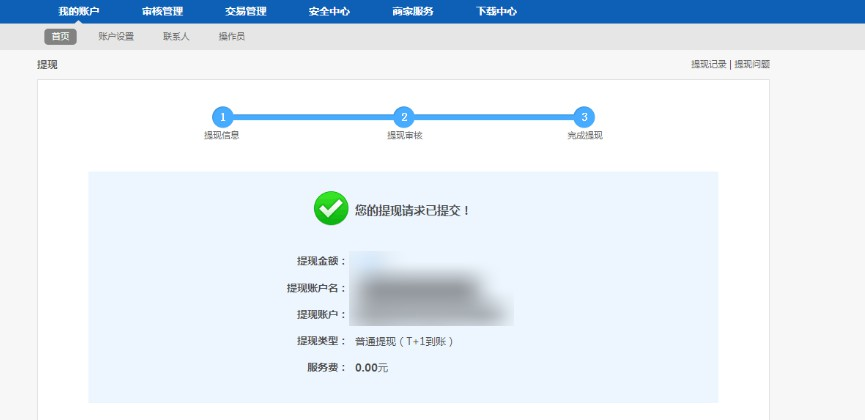 5)提现请求提交成功。如果该操作员同时具有申请和审核权限,则提现操作将提交给银行;如果该操作员只有申请权限,则需要具有审核权限的操作员再做确认。